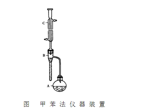 儀 器 裝 置 如 圖 。 A為5 0 0 m l的 短 頸 圓 底 燒 瓶 ; B為 水分測定管;C為直形冷凝管,外管長40cm。使用前,全部儀器應清潔,并置烘箱中烘干。