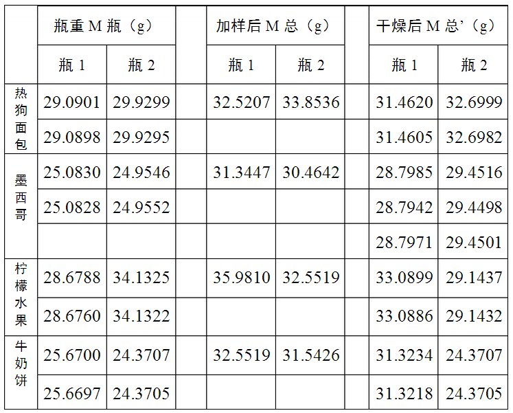 通過對兩個樣品水分含量的測量結(jié)果數(shù)據(jù)分析表明:兩個稱量瓶中所裝樣品一樣,之所以得出的水分含量不同,除了實驗儀器引起的系統(tǒng)誤差外,還與操作的的熟練程度產(chǎn)生的誤差有關(guān)。可能是由于兩個樣品放進(jìn)干燥箱中的時間快慢有差別,從干燥箱取出移入天平室干燥器的途中吸收了空氣中的微量水分。因此取兩個樣品水分含量的平均值比較接近面包、蛋糕和干點水分含量的真實值,但永遠(yuǎn)達(dá)不到其真實值。