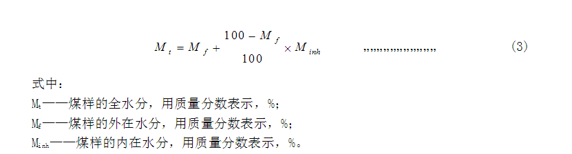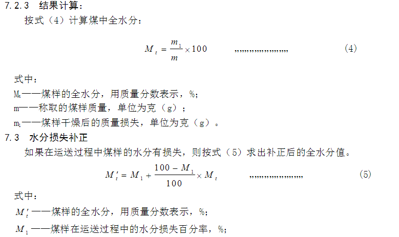 7.2.2.1.4 進行檢查性干燥,每次30min,直到連續兩次干燥煤樣的質量減少不超過0.5 g或質量增加時為止。在后一種情況下,采用質量增加前一次的質量作為計算器依據。 7.2.2.2 粒度<6mm煤樣的全水分測定