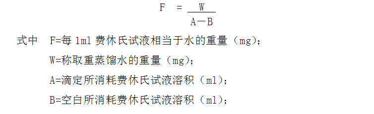 4.1.2 標(biāo)定取重蒸餾水約10~30mg,精密稱定,置干燥的帶橡皮塞玻瓶中,通過有無水甲醇的滴定裝置加無水甲醇2ml后,立即用費(fèi)休氏試液滴定,在不斷振搖下,溶液由淺黃色變?yōu)榧t棕色即得。另以2ml無水甲醇作空白對(duì)照,按下式計(jì)算即得: