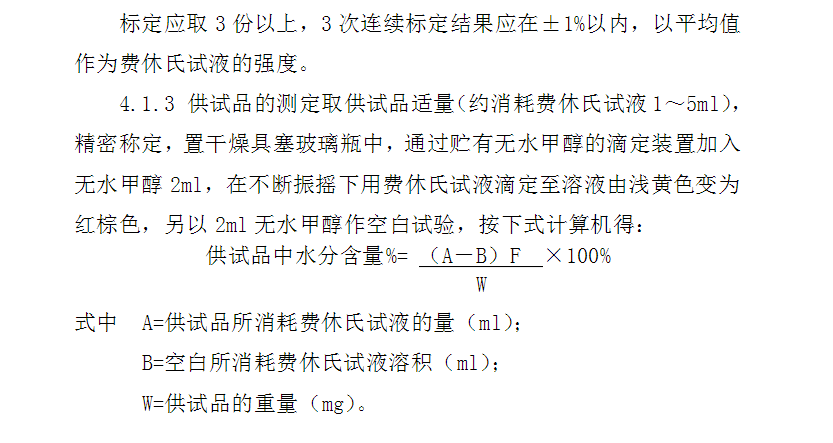 4.1.4 滴定完畢后,將費(fèi)休氏試液移入貯存瓶中密閉保存,滴定裝置用甲醇洗滌,以防滴管頭及磨口和活塞處析出結(jié)晶以致堵塞。