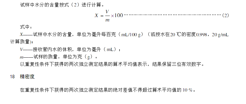 加熱慢慢蒸餾,使每秒鐘的餾出液為兩滴,待大部分水分蒸出后,加速蒸餾約每秒鐘4滴,當水分全部蒸出后,接收管內的水分體積不再增加時,從冷凝管頂端加入甲苯沖洗。如冷凝管壁附有水滴,可用附有小橡皮頭的銅絲擦下,再蒸餾片刻**接收管上部及冷凝管壁無水滴附著,接收管水平面保持10 min不變為蒸餾終點,讀取接收管水層的容積。 17 分析結果的表述