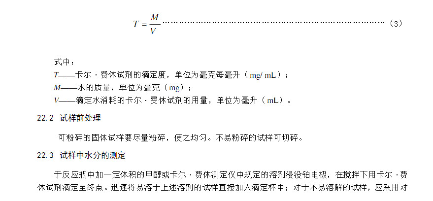 滴定杯進行加熱或加入已測定水分的其他溶劑輔助溶解后用卡爾·費休試劑滴定**終點。建議采用庫侖法測定試樣中的含水量應大于10 μg,容量法應大于100 μg。對于某些需要較長時間滴定的試樣,需要扣除其漂移量。 22.4 漂移量的測定