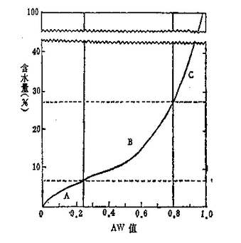 拉布薩(T.P.Labuza)在總結(jié)食品的穩(wěn)定性和Aw之間的相對關(guān)系時,闡明了食品水分和間存在有內(nèi)在的相互關(guān)系。并可用等溫吸濕曲線(Water sorption isothermal Curve)來表示。在一定的溫度下,食品由于吸濕或放濕,所得到的水分活度與含水量之間關(guān)系的曲線稱為等溫吸濕曲線(圖1-1)。從這個曲線可以看出食品中水分存在的幾種狀態(tài)。如果把這個曲線分為三個區(qū)段,Aw在0~0.25之間為A區(qū)段,水分牢固地與食品中某些成分結(jié)在0.25~0.80之間為B在
