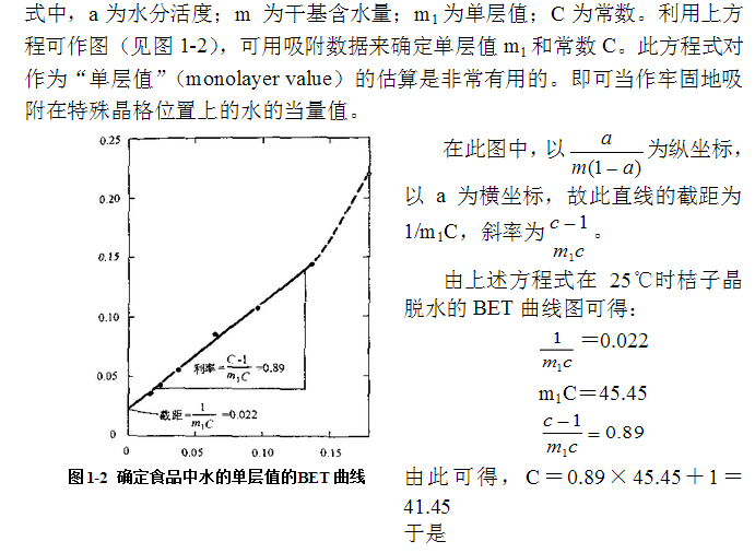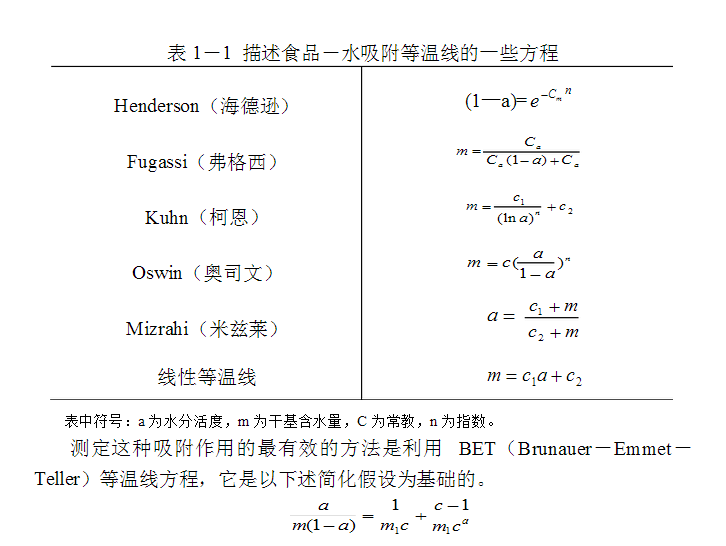 食品的典型吸附等溫線是反S型的,并可近似地由數(shù)字關(guān)系式表達(dá)(見表1-1)。