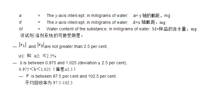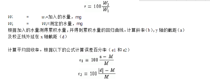 通過選擇的試劑/溶劑系統(tǒng)測定供試品的含水量。然后,通過適宜的方式(**少5次)連續(xù)加入已知量的水,每次加水后測定累積含水量。根據(jù)下面的公式計算每點的回收率(r):