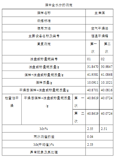 (3 )從干燥箱中取出稱量瓶;立即蓋上蓋,在空氣中放置約 5 min,然后放入干燥 器中,冷卻到室溫(約 20min),稱量(稱準到 0.01 g)。 (4)進行檢查性干燥, 每次 30min, 直到連續兩次干燥煤樣質量的減少不超過 0.01g 或質量有所增加為止。在后一種情況下,應采用質量增加前一次的質量作為計算依據。 五、實驗記錄和結果 (1)實驗記錄如下表所示
