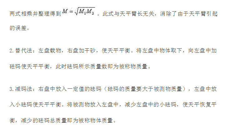 為使測量更精密,消除天平不等臂等因素引起的誤差,可以采用下列方法: 1.復稱法:左盤放物體,右盤加砝碼,稱量值為(M1) ;然后將物體放右盤,左盤放砝碼稱量值為(M2) ,設天平左臂長為(L1) ,右臂長為(L2) ,物體質量為(M) ,則:
